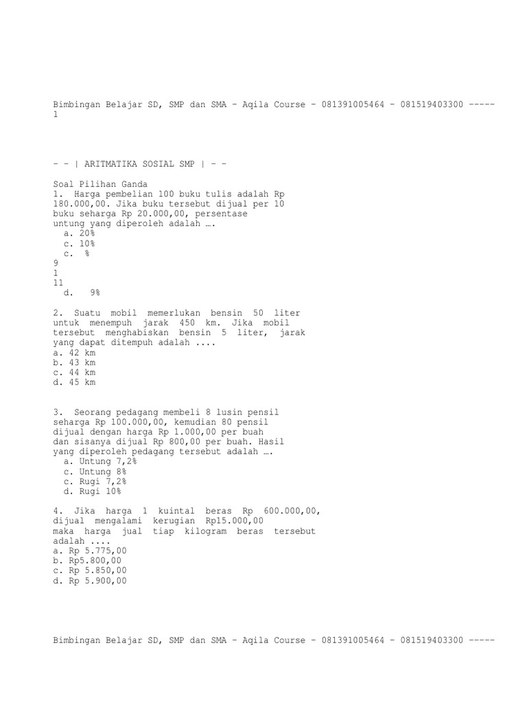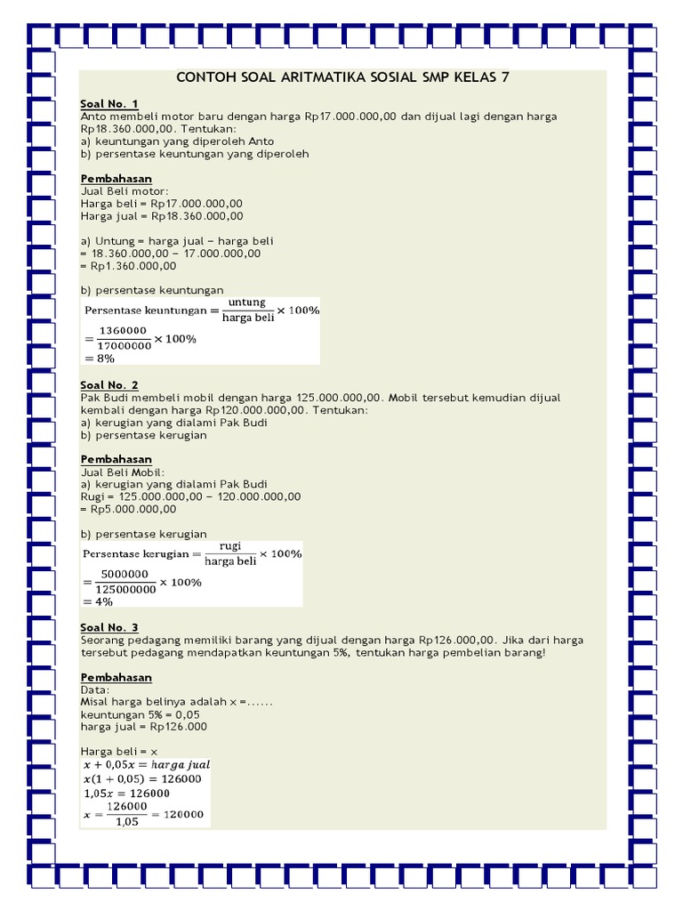 Soal Matematika Smp Aritmatika Sosial Language:id : Jika besar uang yang didepositokan rp 2.500.000,00 maka besar bunga selama 3 bulan adalah….. 2) un matematika smp / mts tahun 2008 sebuah bank memberikan bunga deposito 9% setahun. Menghargai dan menghayati ajaran agama yang dianutnya. Kumpulan model soal ujian nasional matematika untuk smp tentang arigmetika sosial. Soal ini merupakan soal uji kompetensi 6 yang terdiri dari 20 soal pilihan ganda. Jika ada kritik, saran atau pertanyaan silahkan tulis di kolom komentar.